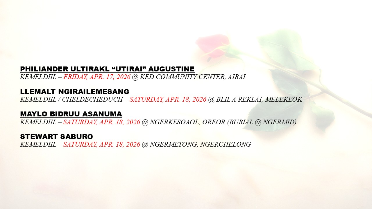 - A KEMELDIIL A MO ER NGII ER A PALAU FUNERAL HOME & CHAPEL EL NGA ER A NGETKIB, AIRAI EL OMUCHEL ER A 9:00AM EL MO IKREL A SUELEB, E MO MEDAKL ER A BELUU ER A NGARCHELONG